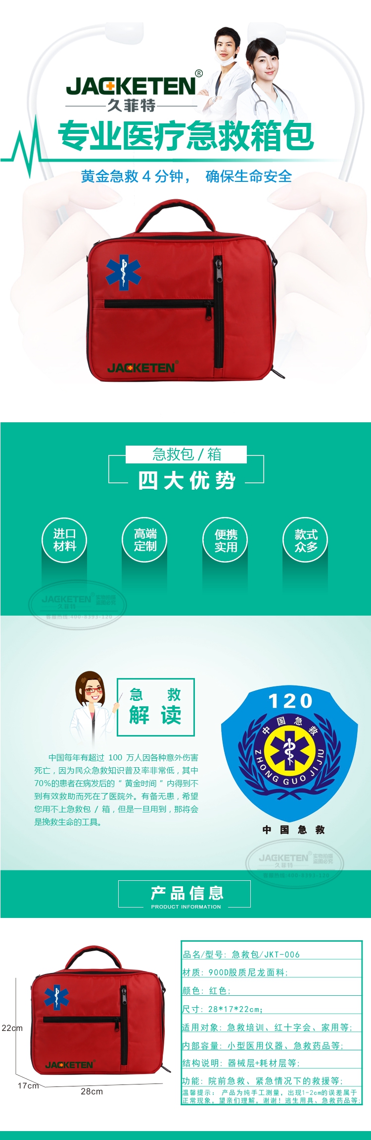 品名/貨號:急救包/JKT-006;材質(zhì):900D股質(zhì)尼龍面料;顏色:紅色;尺寸:28*17*22cm;適用對象:急救培訓(xùn)、紅十字會(huì)、家用等;內(nèi)部容量:小型醫(yī)用儀器、急救藥品等;結(jié)構(gòu)說明:器械層+耗材層;功能:院前急救、緊急情況下的救援等