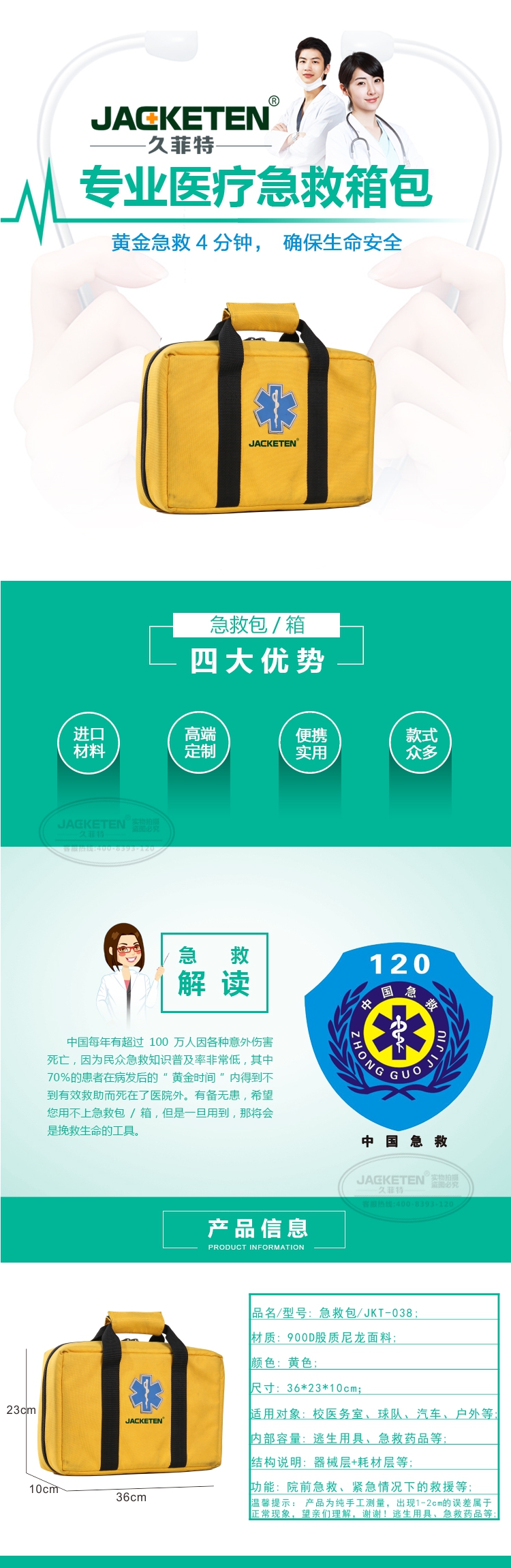 品名/貨號:急救包/JKT-038;材質(zhì):900D股質(zhì)尼龍面料;顏色:紅色;尺寸:36*23*10cm;適用對象:校醫(yī)務(wù)室、球隊、汽車戶外等;內(nèi)部容量:逃生用具、急救藥品等;結(jié)構(gòu)說明:器械層+耗材層;功能:院前急救、緊急情況下的救援等