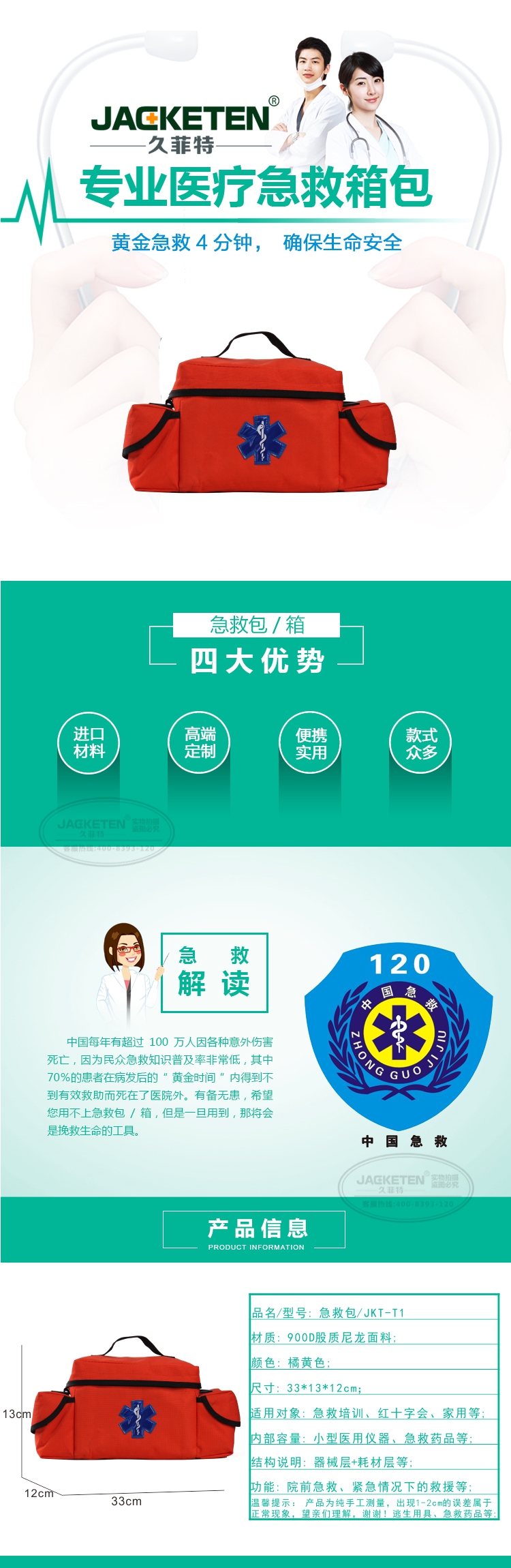 品名/貨號(hào):急救包/JKT-T1;材質(zhì):900D股質(zhì)尼龍面料;顏色:橘黃色;尺寸:33*13*12cm;適用對(duì)象:急救培訓(xùn)、紅十字會(huì)、家用等;內(nèi)部容量:小型醫(yī)用儀器、急救藥品等;結(jié)構(gòu)說明:器械層+耗材層;功能:院前急救、緊急情況下的救援等